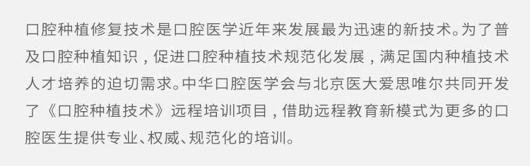 口腔种植修复技术是口腔医学近年来发展最为迅速的新技术。为了普及口腔种植知识,促进口腔种植技术规范化发展,满足国内种植技术人才培养的迫切需求。中华口腔医学会与北京医大爱思唯尔共同开发了《口腔种植技术》远程培训项目,借助远程教育新模式为更多的口腔医生提供专业、权威、规范化的培训。